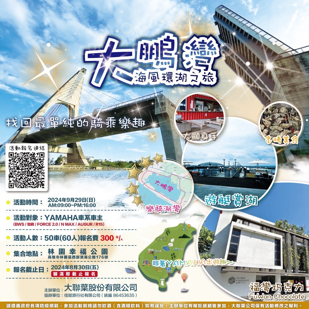 • 本網站由YAMAHA地方販路架設維護,而非YAMAHA台灣山葉機車官方網站, 主要服務內容為高屏/台東地區Yamaha新車購車優惠、活動訊息, 希望能帶給消費者優質的賞車體驗。販促內容以大聯葉股份有限公司公告為主。