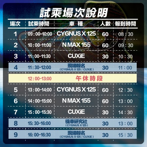 第一梯次(已額滿) 試乘機種:CYGNUS X 125